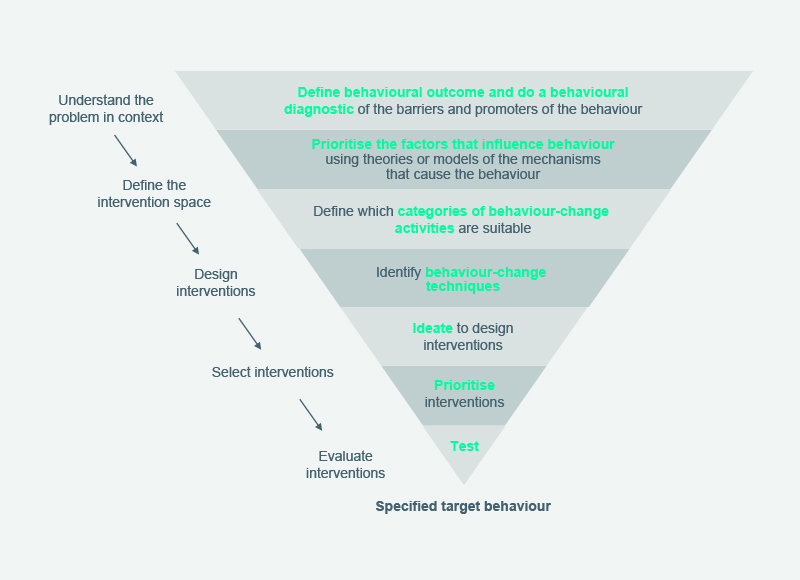 Behavioural science is a ‘hot topic’ and many individuals and organisations are exploring how to use it. However, some approaches fail to consider the underlying principles or theory, use just one model of behaviour, or lack a systematic process that yields effective behaviour-change solutions. At Innovia, we believe that human behaviour is too complex to be explored in this way. Instead, we use a rigorous, and structured approach (see left) that makes use of the theory and evidence of what is effective and applies a variety of validated models. We are solution neutral – seeking the best approach to meet your unique challenge. We believe that this approach is essential to give confidence in the solutions that we generate. And our clients agree.